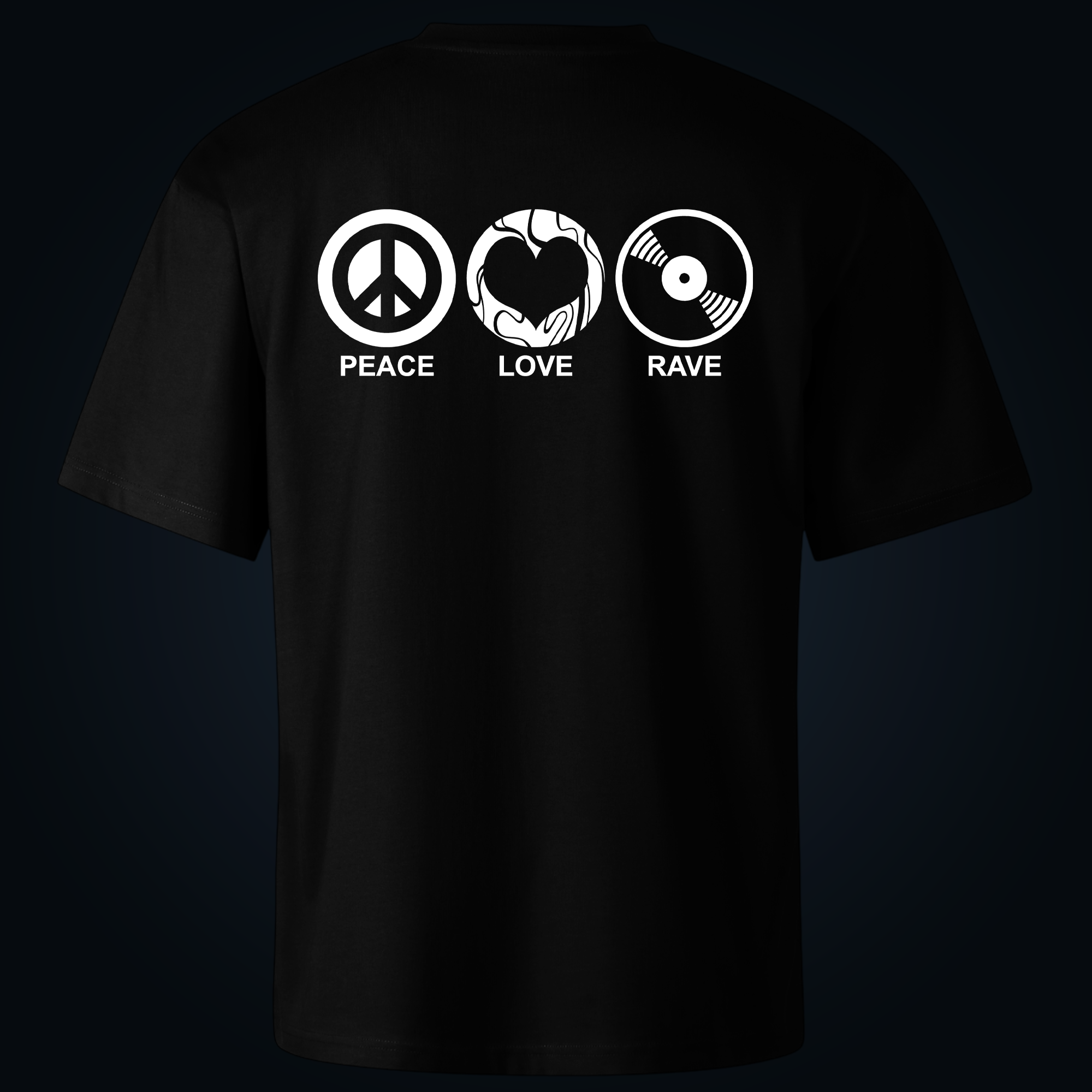 Peace, Love, Rave oversized t-shirt backprint